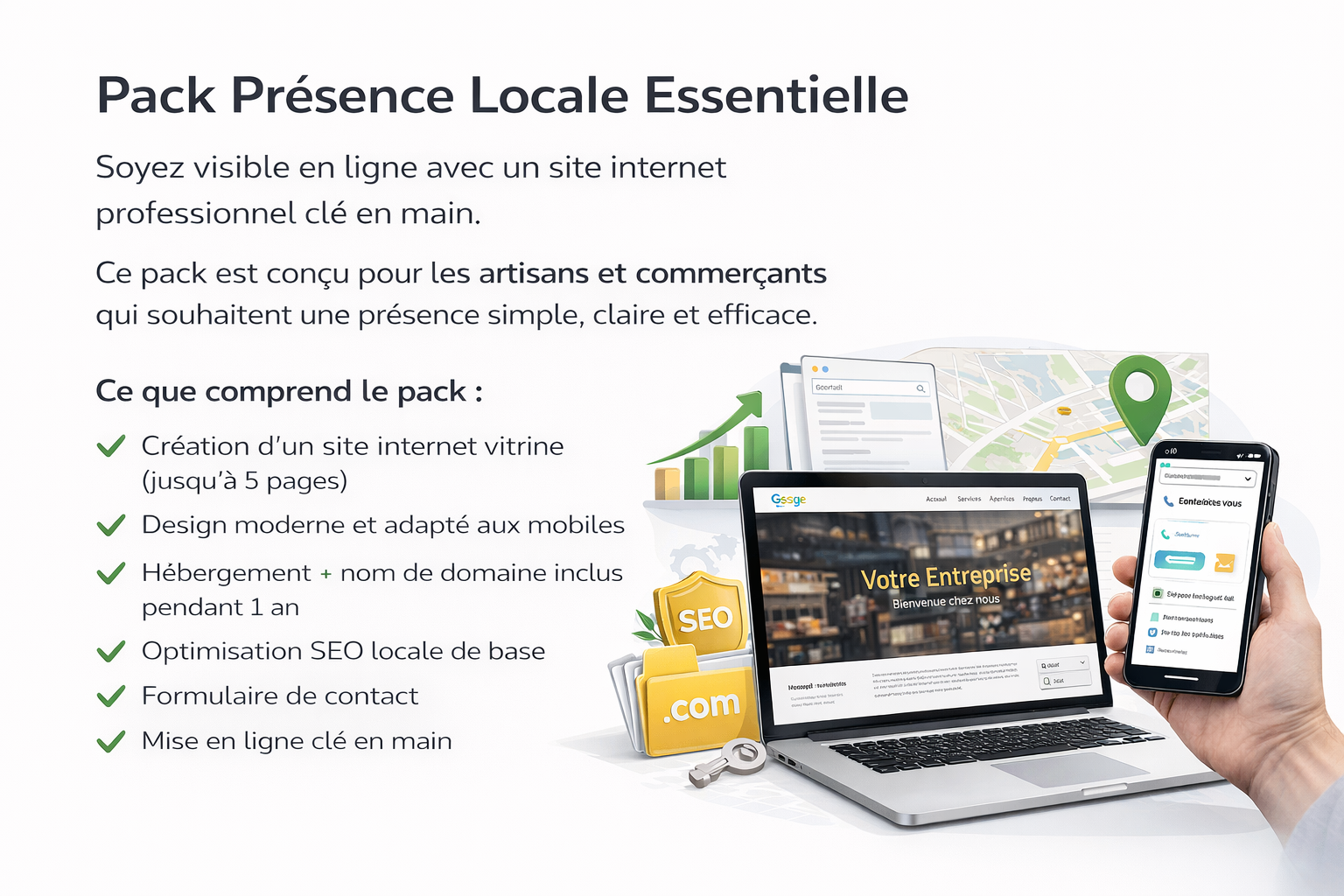 Ce pack est idéal pour les artisans, commerçants et indépendants qui veulent une présence simple, propre et efficace.